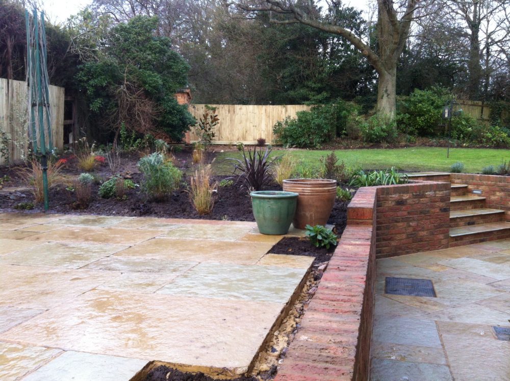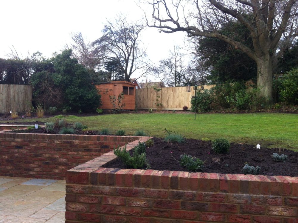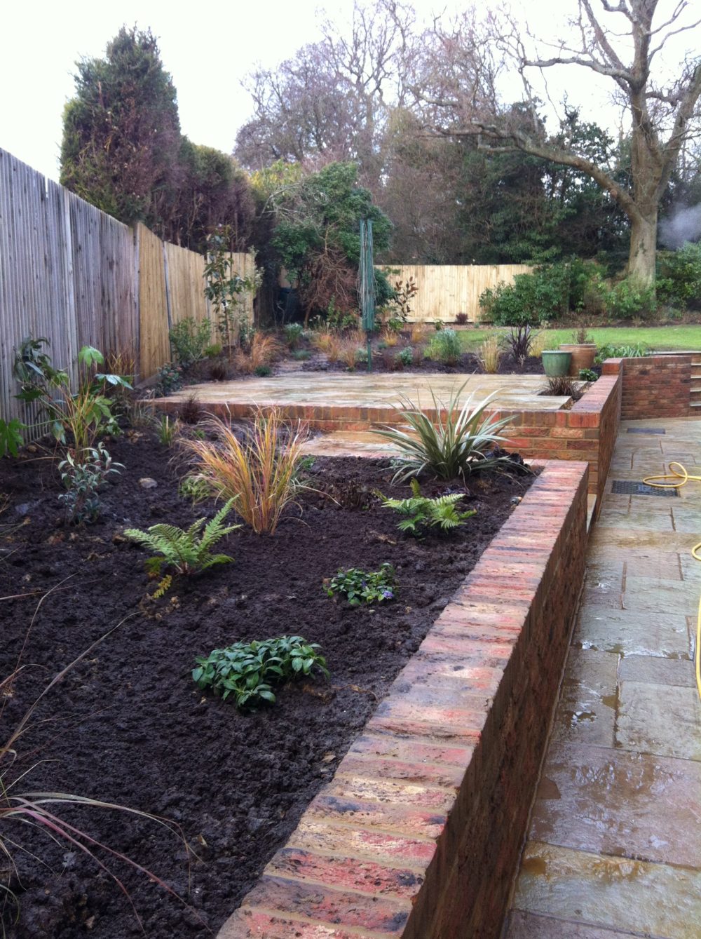 The garden sloped upwards almost immediately outside the back of the house. We created a zig zag retaining wall further away from the house providing a large patio area with two snug corners. We reshaped the lawn, and built a raised lounging area to the side for more private relaxation in the sun.